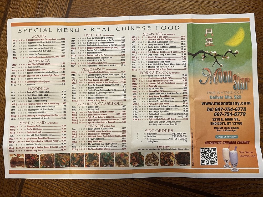 Introducing Moon Star, a Chinese restaurant located at 3218 E Main St Endicott, NY. This casual eatery offers a variety of traditional Chinese dishes, with a wide range of appetizers and special menu items like Beef Tripe Hot Sauce and Sliced Fish with Sour Cabbage Soup. Moon Star provides a comfortable dining experience with options for takeout, delivery, and catering. The menu includes many vegetarian options and is known for its flavorful dishes such as Kung Pao Shrimp and Chicken. Customers praise the quick service, welcoming atmosphere, and friendly staff. If you're looking for authentic Chinese cuisine in the area, Moon Star is the place to be.